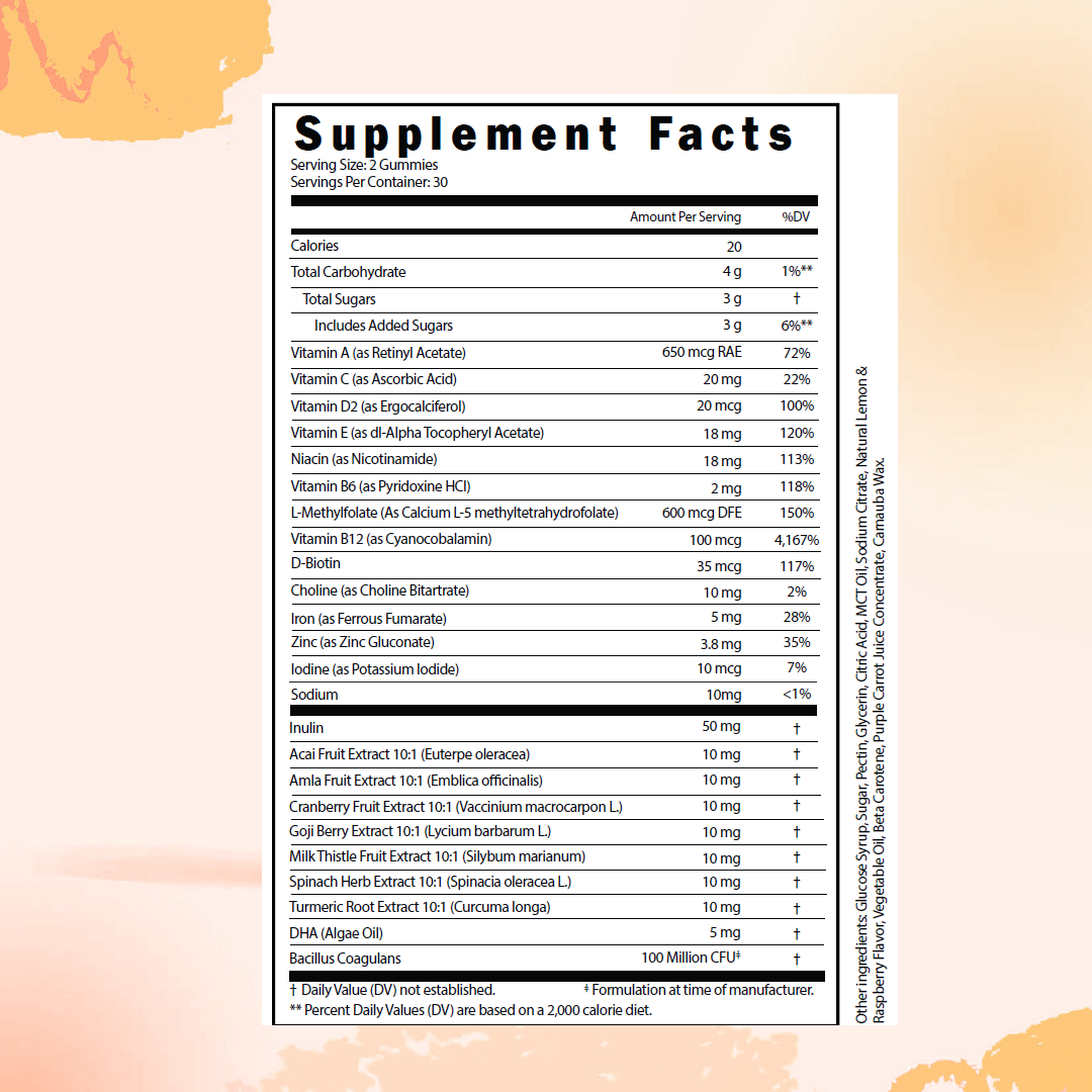 Formulated with over 15 essential vitamins and minerals — including Vitamin A, C, D2, E, B-complex, Iron, Zinc, and Iodine — to help fill nutritional gaps and support whole-body wellness.